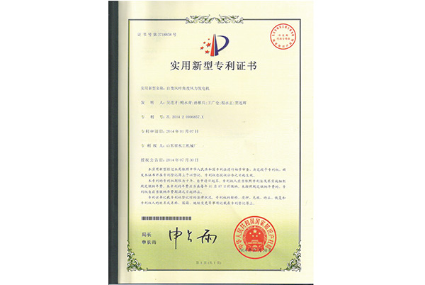 實用新型專利證書—自變風(fēng)葉角度風(fēng)力發(fā)電機