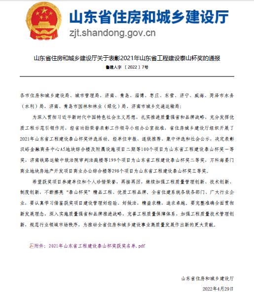 公司兩項工程榮獲2021年度“山東省工程建設(shè)泰山杯獎”