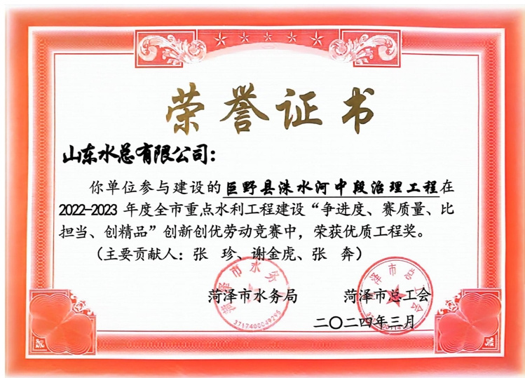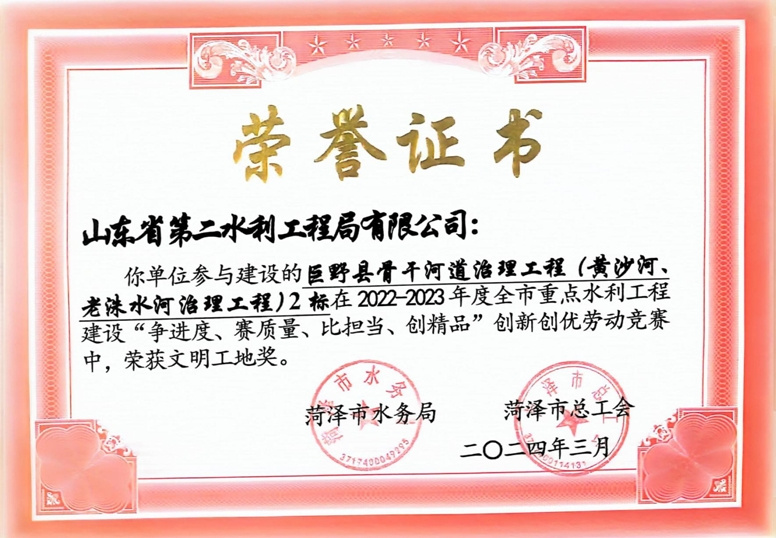 近日,菏澤市水務局、菏澤市總工會公布了“2022-2023年度全市重點水利工程建設“爭進度、賽質量、比擔當、創(chuàng)精品”創(chuàng)新創(chuàng)優(yōu)勞動競賽”獲獎名單,公司及權屬單位二局有限公司共榮獲優(yōu)質工程1項、文明工地2項、QC成果1項,優(yōu)秀項目經(jīng)理1項。